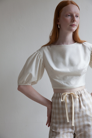 Slightly loose fitting, cropped blouse, drop shoulder seam with gathered puff sleeves, open back ties at neck with mother of pearl button closure at back waist. 100% Silk Noil - Dry clean only. XS - Length: 14.5 Bust: 31 Waist: 27 Sleeve: 11 S - Length: 15 Bust: 33 Waist: 28 Sleeve: 11 M -Length: 15.5 Bust: 35 Waist: 30 Sleeve: 11 L - Length: 16 Bust: 37 Waist: 31 Sleeve: 11 always made in Los Angeles, CA model is 5'9" and wears a size XS
