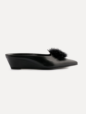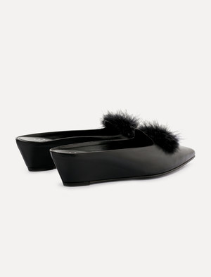 A feminine shoe that nods back to Fred Astaire-era Hollywood. A low wedge heeled leather mule and accented with a whimsical tonal marabou puff. - Made in Italy - 100% leather - European sizing - Narrow fit