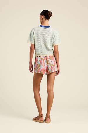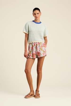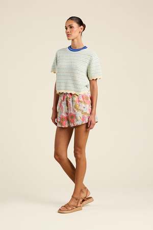 The Jules Aqua Sweater by Trovata features an aqua and white stripe. Made from 100% cotton. Fit: True to size. Made in China.