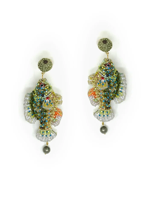 Cotton, felt, metal, sequins, and beads. Drop post earrings. Hand embroidered in India. Produced in small batches. Each piece may show slight variations in embroidery, size, shape, and color due to the handmade nature of the craft; these are marks of 'Made by Hand.' Dimensions: 3" l x 1.2" w.