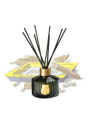The Trudon Ernesto Diffuser gives a scented aura of being in a hotel of Havana, under the fixed sun of the Revolution: the fierce and partisan overtones of leather and tobacco meddle with the paneling's waxen silence. In the cool dimness, fawn grimaces shimmer along with the smoke of cigars and the barrels of guns. Housed in large glass bottles, hand-made in Tuscany. - 350ml - H: 18 cm D: 7 cm - Head Notes: Bergamot, Grapefruit, Rhum - Heart Notes: Oak Wood, Clove, Labdanum, Patchouli - Base Notes: Tobacco, Amber, Leather, Moss - The diffuser allows a 3 to 4-month long, passive diffusion