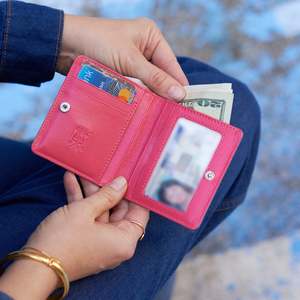 Siam Snap Evening Wallet The Snap Evening Wallet couldn't be any cuter. Despite its tiny size, this silhouette is a full-functioning wallet complete with a billfold, 3 card slots, 3 hidden slots, ID window, and outside zipper pocket for coins. With this style, there is no need to leave behind your wallet due to mini bag space limitations. Details 3.75"L x 3.25"H Glazed Italian Kidskin Contrast Color Interior Non Fray Nylon Lining with Nickel Hardware Signature Tusk logo2 Style #JR-486