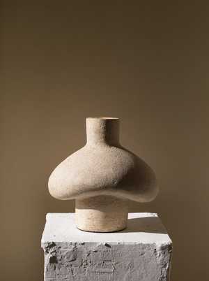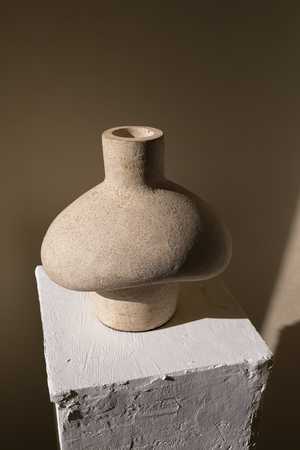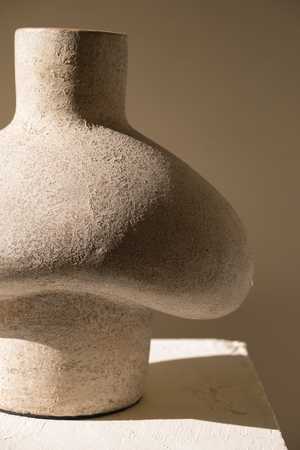 The Tana vessel is an elegant terracotta sculpture handmade by local Indonesian artisans. The vessel's name comes from Tanah Lot, an ancient Hindu temple dedicated to the gods of the sea. Its pristine shell-white color gives a beachy feel, while its interesting shape that resembles a hut is a callback to coastal living. This beautiful sculpture is the perfect addition to any room, desk, or countera fusion of functionality and creativity crafted using techniques passed down through generations. Use it as a vase for your dry stem or as a standalone display. Materials: Terracotta clay, cream underglaze, highly textured matte cream glaze. Size dimensions: 10"L x 7.8"W x 11"H