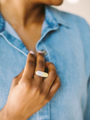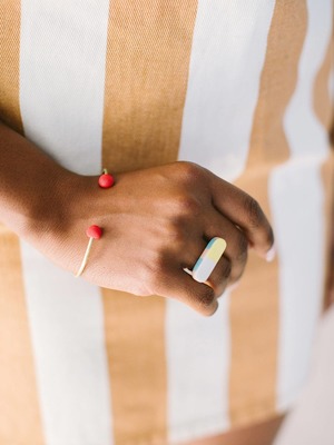 A modern, geometric cocktail ring with a colorblock design. Small/Medium fits approximately like a ring size 5/6. Medium/Large fits approximately like a ring size 9/10. Materials: Porcelain, Sterling Silver.