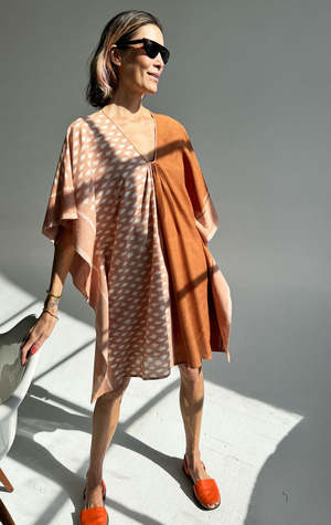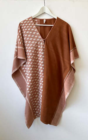 Our shorter signature caftan in gorgeous terracotta Ikat with pale peach color block. This is a mid weight hand woven cotton fabric with opaque coverage. The fabric drapes beautifully on the body and this piece can be worn on its own as a dress or as a fabulous coverup for the beach. - Ikat weave - Hand woven cotton - Length 34 1/2" Width 28"