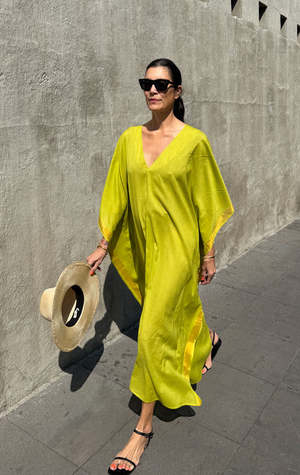 Our v neck sari caftan in a beautiful bright citron. soft handwoven cotton. This caftan works for multiple sizes. Model is size 4 As this is a handmade product we recommend hand wash cold to extend life. Color: citron - Width 45" flat across Length 50" - Opaque cotton - One size fits all - (fits up to size 16)