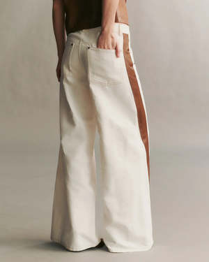 TWP's Almost Famous Jean is a mid-rise wide leg, crafted in soft and stretchy Japanese denim. Almost famous is relaxed at the hip, flared at the leg, and features elegant brown and white tux stripes down the side of each leg. Complete with a five-pocket style, nail head rivets at the front pockets, a zip-fly, shank button up waistband, and subtle contrast stitch finish at the seams. Product Details Color: White/Cigar Composition: 70% Cotton, 30% Linen; Combo: 100% Lambskin Made in USA