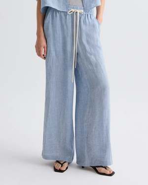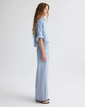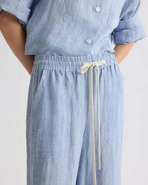 Mid-rise, pull-on pants in lightweight washed hemp denim. This fabric is lightweight and washed to create a naturally distressed effect. The Main St. has a relaxed, wide leg. Complete with deep side pockets, elasticated waistband, and cotton drawstring. Composition: 100% Hemp Color: Light Indigo Fit: Model is 5'10'' with 32.5'' bust / 34.5'' hips. Wearing size S.