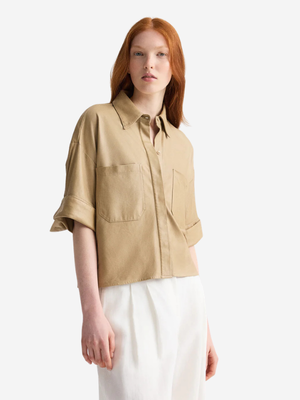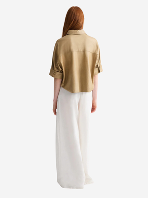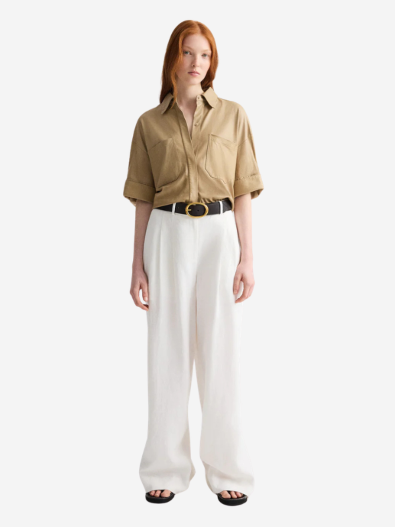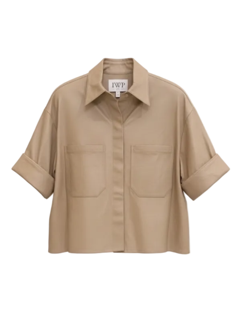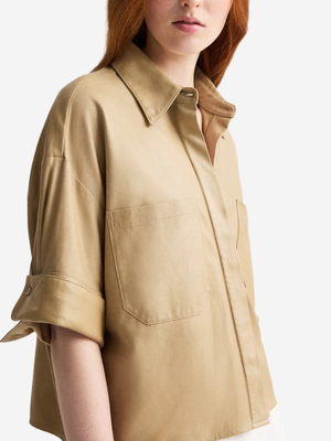 TWP's My Newest Mistake Shirt is designed with a relaxed, boxy fit, dropped shoulders, and cuffed short sleeves in paper leather. Finished with a point collar, chest patch pocket, and clean hem. Product Details Designer ID: 55498L L022 Composition: 100% Lamb Leather Imported.