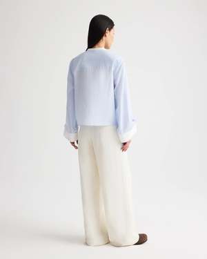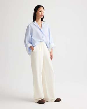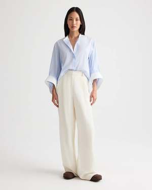 The Hudson St Pant by TWP is a relaxed mid-rise pant in coated viscose linen. The fabric combines European flax linen and a viscose coating for an elegant drape and a subtle satiny sheen. Designed with front pleats that open into a draped, wide-leg silhouette. Finished with an elasticized back waistband, side seam pockets, a single welt pocket at the back, and subtle topstitch detailing throughout. Composition: 76% Viscose, 24% Linen. Color: Bone. Fit: True to size.