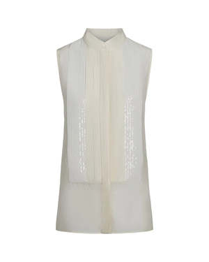 The Adele Blouse with Sequins by TWP is a semi-sheer blouse featuring a sequin-embellished bib, yoked back, and high neckline.\n\n- Relaxed fit\n- Button front closure\n- Dry clean\n- Made in Italy