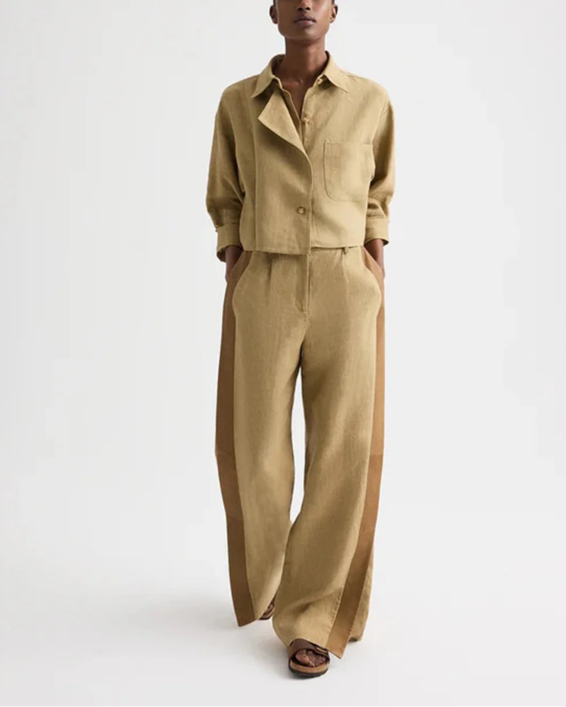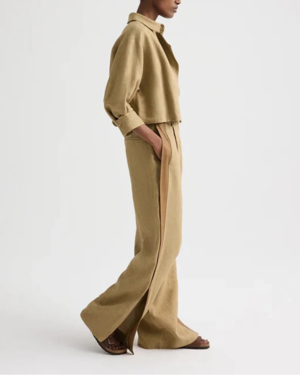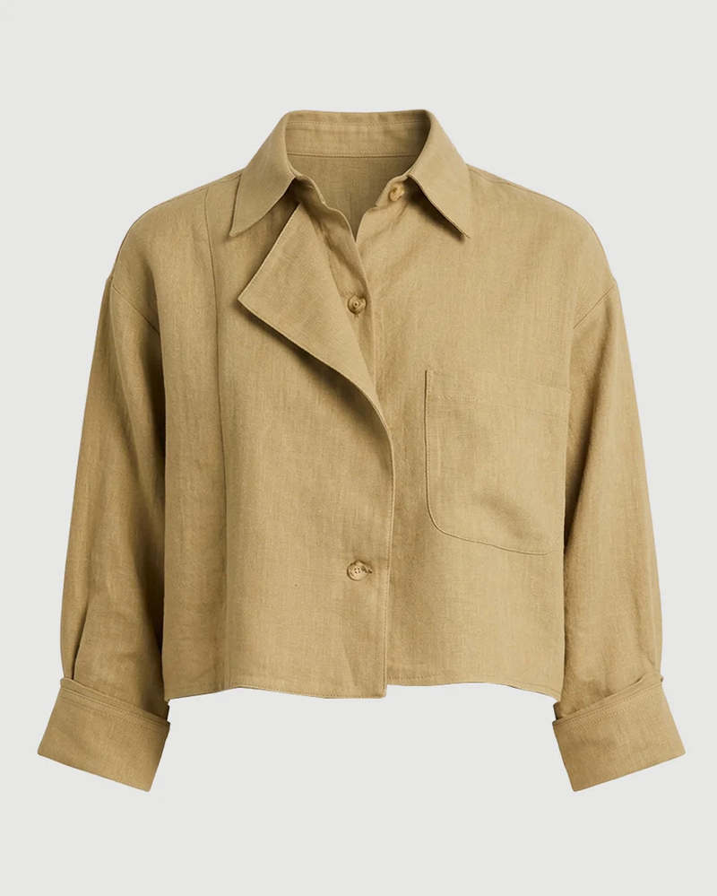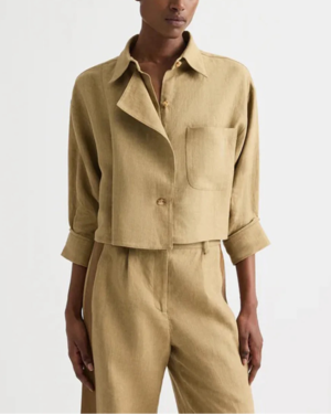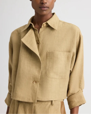 The Next Chapter Top in washed linen by TWP is a cropped button-front top featuring a relaxed, boxy silhouette, chest patch pocket, classic point collar, and signature double-roll button cuffs. Material: 100% Linen Fit: Cropped fit Model is 5'10" and wearing a size Small.