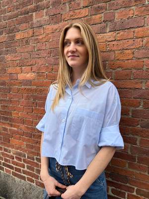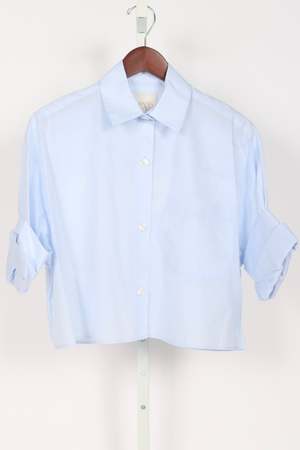 TWPs signature short sleeved button down crafted in superfine Italian cotton shirting. The Next Ex is a cropped, boxy silhouette, complete with a chest patch pocket, button up placket, spread collar, and our signature double roll button cuffs. 100% COTTON BABY BLUE