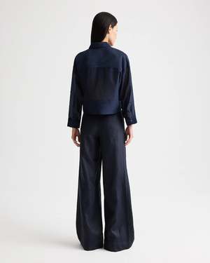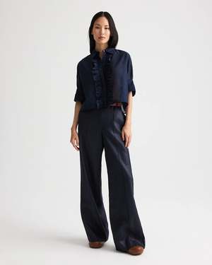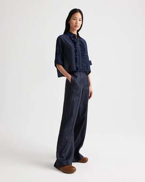 TWPs signature short-sleeve button-down with ruffle detail, crafted in a cotton-silk organza. The fabric is a lightweight, sheer silk-cotton blend woven in a crisp plain-weave organza. The Next Ex features a cropped, boxy silhouette with a ruffled front placket for soft texture and dimension. Finished with a spread collar, concealed button closure, and signature double-roll button cuffs. Composition: - 70% Cotton - 30% Silk Size + Fit: - True to size - Women's sizing About TWP: In 2021, Trish Wescoat Pound founded TWP to create the clothes she was constantly searching for. Each collectsion seamlessly merges meticulous tailoring, luxurious fabrications, and elegant details, offering a womans wardrobe of effortless ease and downtown sensibility. TWPs collectsions are grounded in uncompromising quality and craftsmanship; fabrics are predominantly sourced from the finest mills in Italy and locally manufactured in New York City.