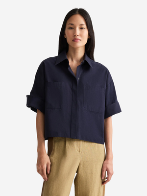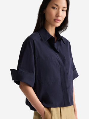 TWP's My Newest Mistake is a short-sleeve button-up in superfine Italian cotton shirting. The My Newest Mistake Shirt is designed with a relaxed, boxy fit, dropped shoulders, and cuffed short sleeves. Finished with a point collar, chest patch pocket, and clean hem. Product Details Designer ID: 55498W510 Color: Midnight Composition: 100% Cotton Made in USA.