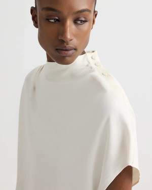 Short-sleeve mock-neck tee crafted in coated viscose linen. The fabric blends European flax linen with a viscose finish for fluid drape and a subtle, satiny sheen. Designed with an asymmetric front wrap detail and a relaxed, slightly boxy silhouette. Finished with a refined shoulder button closure, clean-cut sleeves, and subtle back seam detailing. Composition: 76% Viscose, 24% Linen Color: Bone Size: True to size.