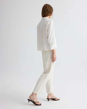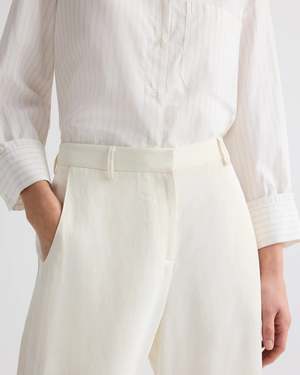 Mid-rise, barrel leg pants in a coated viscose linen. This fabric holds the weight of natural linen and has a satiny sheen. Jett Pants feature a relaxed silhouette with darts at the knee. Complete with a concealed zip fly, hook-and-eye closure, belt loops, deconstructed deep side pockets, and two back pockets. Composition: 76% Viscose, 24% Linen Color: Bone Fit: True to size. Designer ID: N528037-W185.