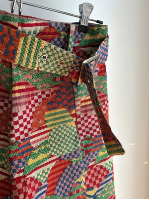 Thick skirt with belt, lining, and side zip. Flat measurements are approximately 17 inches long and 14 inch waist.