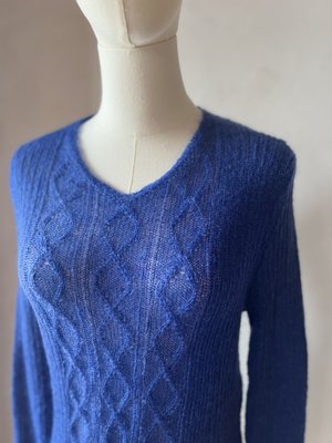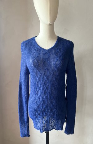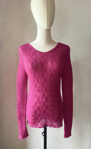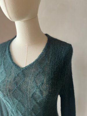 The Aurora Mohair Sweater is a delicate yet statement-making piece, crafted from a luxurious mohair blend for an ethereal, soft feel. Its fine, airy knit creates a lightweight yet cozy texture, making it perfect for layering in any season. The intricate diamond cable-knit detailing adds depth and elegance, subtly enhancing the sweaters refined aesthetic. Designed with a flattering V-neckline and long sleeves, the Aurora Mohair Sweater offers both comfort and sophistication. The sheer quality of the knit allows for effortless styling, whether worn over a camisole for a chic layered look or on its own for a subtly bold statement. Available in a range of rich and soft hues, this sweater embodies timeless beauty with a modern twist. One Size - Fits better S - M Hand wash or dry cleaning recommended.