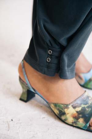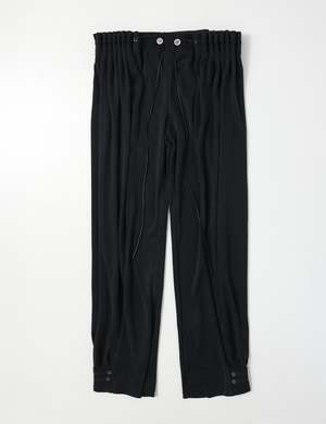 Jogger pants with "curtain" stylistic detail at the hips in washed black. Use the cords to adjust and play with the silhouette. Adjustable snap button closures at the leg opening. 75% Modal, 25% Polyester. Made in Korea. By ULIKASANCTUS.