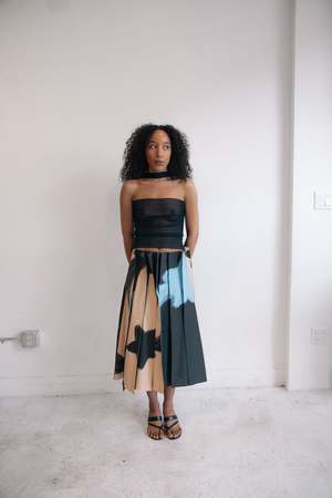Modular sheer top that can be worn in a number of ways: as a tube top, cowl neck, or with neck ties. In a midnight blue-black color. 100% Polyester Made in Korea. ULIKA SANCTUS is known for its blend of architectural design, delicate tailoring, and quiet strength, creating feminine yet resilient clothing inspired by themes of absence, memory, and inner stillness.
