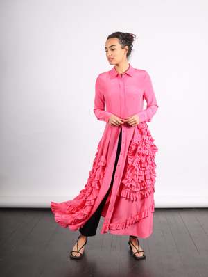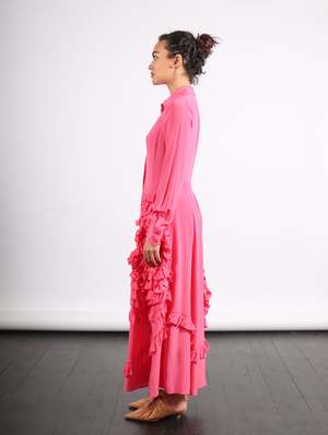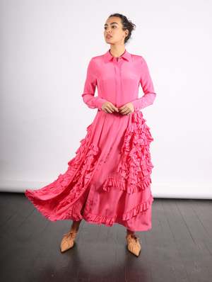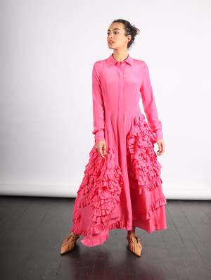 Crafted from silk crepe de chine, the Gwen Dress showcases a timeless shirt silhouette that is decorated with cascading spiral ruffles. The long-sleeve fuchsia dress features a flowing maxi hemline and hidden front buttons. This dress also lends itself to being styled as a duster, with the buttons left open over a tank and denim. Cheyenne is 5'7" and a size XS wearing the 0. About brand 2 Born and raised in Manhattan, Ulla Johnsons signature is the blending of street style with global references. Raised by archaeologists, Johnsons childhood included travel all over the world, developing her interest in local textiles and art. Founded in 1998, her eponymous label is synonymous with vivid floral prints, intricate embroideries, and meticulous finishings. Ulla Johnson encompasses a full range of products with an emphasis on artisanal production processes utilizing natural fibers that provide each garment with ease of wear. Color Fuchsia Details 2 100% Silk Season collectsion SS24 Vendor collectsion gid://shopify/Collection/407111631096 Related products display ahead Fit 2 Take your true size. Care 2 Dry clean only.
