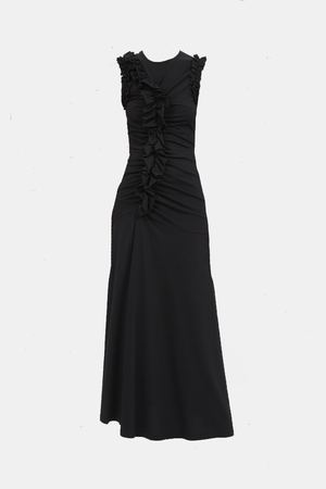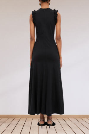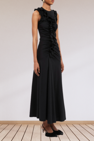 Bendetta Dress is lovingly made from soft organic jersey as part of our continued efforts to support responsible production methods and lower our impact on the planet. Arriving in timeless black, it has ruching that sculpts the form and is embellished with romantic, raw-edge ruffles at the sleeves and front. It unfurls to a classic midi length and fastens with a concealed back zipper. - Composition: 100% Cotton - Invisible zipper - Asymmetric gathering