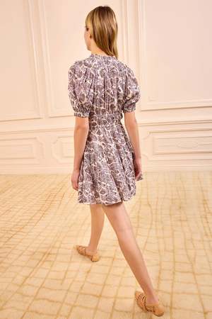 Featuring an intricate all-over floral print, the Soffia dress is crafted from a crisp cotton blend and detailed with delicate ties throughout that add a soft, feminine flair. - V-neckline with ruffle trim - Short puff sleeves - A-line silhouette - Hem falls above the knee - Slipover style Fabric: 66% Cotton, 34% Viscose Care: Hand wash cold. Do not bleach. Do not tumble dry. Low iron. Made in India. Measurements: Fits true to size. We recommend taking your regular size.