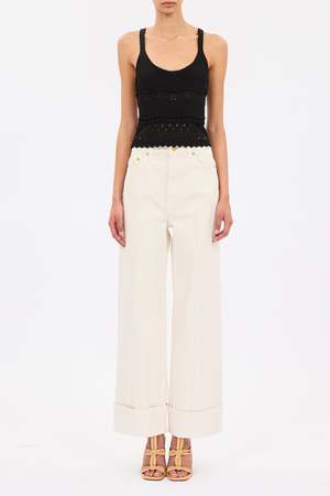 The Esme Camisole is a compact knit elevated with precision-placed scalloped ruffles and eyelet embroidery. The geometric motifs subtly reveal and conceal, while the Cowrie white hue is endlessly versatile. Compact eyelet knit Model height: 5'10" Designed for a close fit Scooped neckline Sleeveless Pullover style Composition: 80% viscose, 20% nylon Dry clean only.