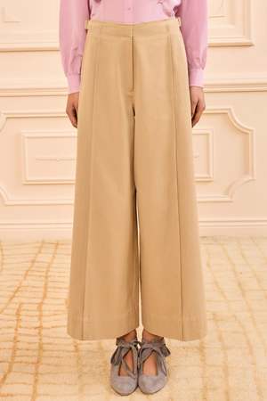The Sascha Trouser by Ulla Johnson is defined by elegant volume, tailored from khaki Italian cotton twill with fluid, cropped wide legs. Sharp pintucks lend soft structure, while side buckles add a utilitarian touch. Italian cotton twill High-rise, wide leg Front and back pockets Concealed front hook, button, and zipper Composition: 100% cotton