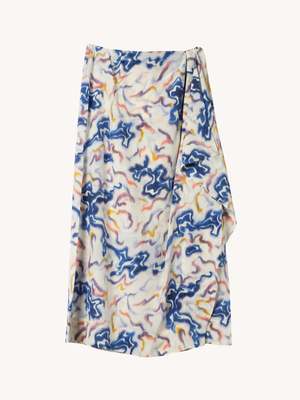 The Magdalene Skirt breathes with vintage-inspired ikat waves that swirl across silk crepe de chine. This multicolored skirt has a wrap-effect silhouette that billows with cascading ruffles and gently flares at the hem. Silk crepe de chine Midi length, fixed high-rise waist Wrap-effect front Concealed side zipper Composition: 100% silk