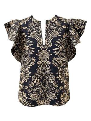 Crafted from cotton poplin, Ulla Johnson's Severine Top is richly graphic with a symmetrical botanical print infused with subtle, batik textures. This black and ivory top features signature flutter sleeves and is loose in form for easy styling with denim or tailoring. Product Details Designer ID: PS260229 Composition: 100% cotton Imported