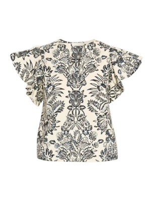 The Severine Flutter Sleeve Top by Ulla Johnson features a rich, graphic, symmetrical botanical print infused with subtle batik textures. This black and ivory top includes signature flutter sleeves and a V-neckline for comfort. Product Details: Designer ID: PS260220 Color: Ivory Floral Composition: 100% Cotton Imported Type: Shirts & Tops