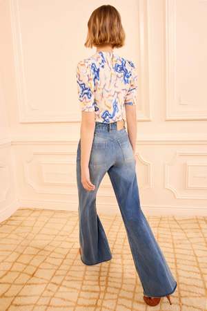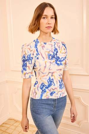 The Corine Top is alive in gesture and hue, patterned with an ikat-inspired print that swirls and melds across silk crepe de chine. The gently puffed sleeves add a subtle, artful touch. - Silk crepe de chine - Round neckline - Puffed short sleeves - Mother-of-pearl button keyhole at back 100% Silk Dry clean only Made in Turkey Designed for a body-skimming fit. Model height 5'10".