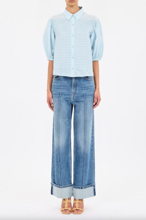 Elevate your spring wardrobe with the Cordelia Top in a beautiful light blue hue. It features delicate horizontal micro pleating that adds the right amount of texture. Style it with The Genevieve Stretch Pintuck Jean in Danube as shown or with trousers for an elegant and chic look. - Cotton - Pointed collar - Puff sleeves - Micro pleating detail - Straight hem Fabric: 100% Cotton Care: Hand wash cold. Do not bleach. Do not tumble dry. Low iron. Made in India. Measurements: Fits true to size. We recommend taking your regular size.