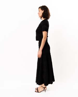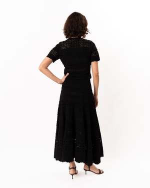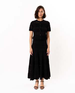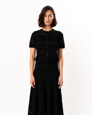 The Abriana Cardigan artfully combines geometric eyelet embroidery with rows of scalloped ruffles. The slightly cropped hemline imbues this layer with timeless versatility. Care Guide Compact eyelet knit Model height: 5'10" Designed for a relaxed fit Crew neckline Short sleeves Buttons through front Composition: 80% viscose, 20% nylon Dry clean only.