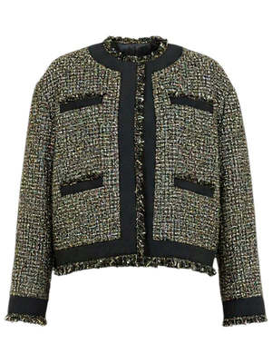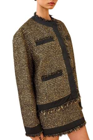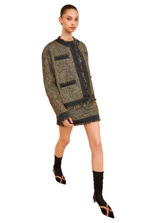 Ulla Johnson's Carmella Coat from Look 5 on the AW25 runway reinterprets classic tweed, developed in Italy with glittering lurex interwoven with soft wool-blend yarn. This beautifully tailored black and gold jacket is framed by lustrous taffeta trims and pairs with the Aleena Skirt for modern elegance. Product Details Designer ID: FA250518 Composition: 48% polyamide, 25% polyester, 10% virgin wool, 10% acrylic, 7% metallized polyester.