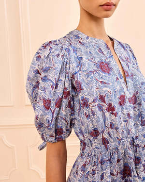 The Adriana Short Sleeve Dress in Gardenia by Ulla Johnson is a cotton A-line midi dress crafted from crisp cotton, featuring a V-neckline, short puff sleeves, and a drawstring waist. Designed with a vibrant abstract print and a comfortable silhouette, it is perfect for spring-to-summer styling. Slipover style. Dry clean or machine wash.