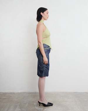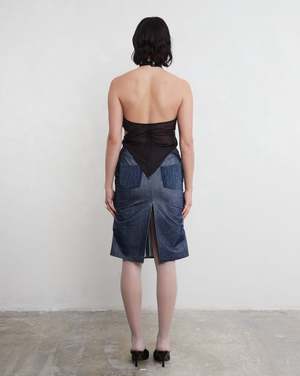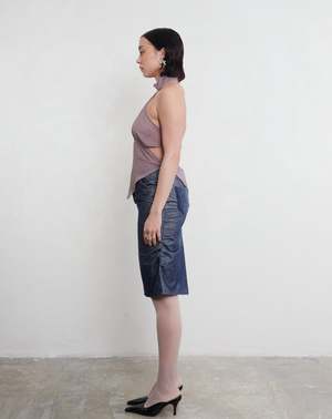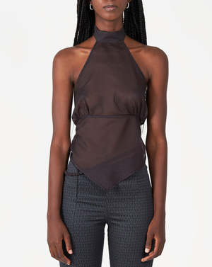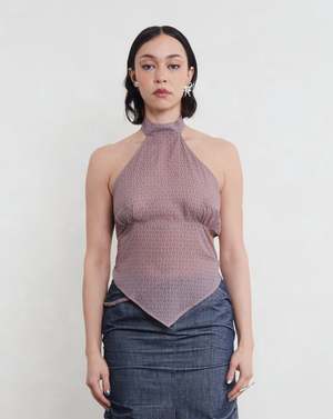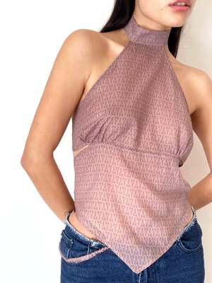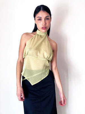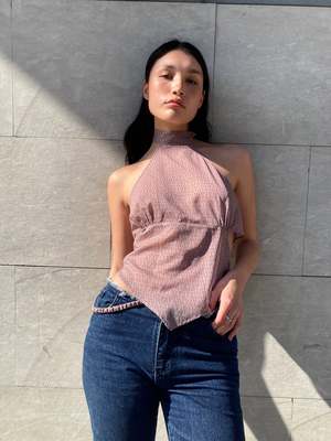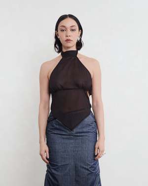 The Anwen top features a halter neckline, fitted silhouette, and cut-out details under the arms, with gathered detail at the bust. Made from recycled georgette with an invisible zipper closure at the center back. Delivery: July 1-2 WEEK DELIVERY TIME (Depending on location) Fabric composition: 100% Recycled PL Model wears: Size S Care info: Hand wash.