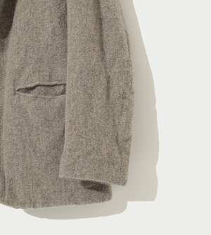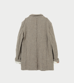 Single-breasted felted wool jacket with a notched lapel collar, two-button front closure, and exposed raw seams for a subtle deconstructed effect. Tailored silhouette with front flap pockets and full internal lining. Vendor Color: Gray Beige. Vendor Style: UC2E4101-4. Fabrication: 100% Wool. Made in Japan.