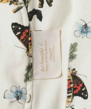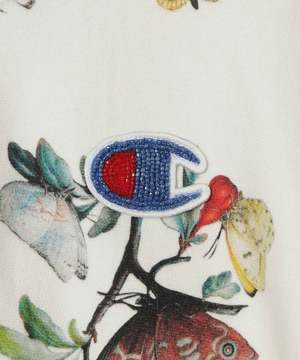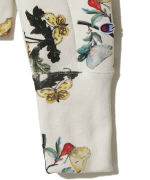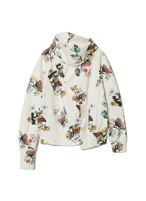 Champion x UNDERCOVER zip-up hoodie in cotton/polyester all-over print fleece with asymmetrical paneling. Features beaded embroidery and patch at front, tag at back, and patch at cuff. Color: Ivory Base Material: 90% cotton, 10% polyester; rib: 100% cotton Size: M: Length 63 cm, Width 58.1 cm, Shoulder 49.5 cm, Sleeve 59.9 cm L: Length 65 cm, Width 60.1 cm, Shoulder 51 cm, Sleeve 61.1 cm