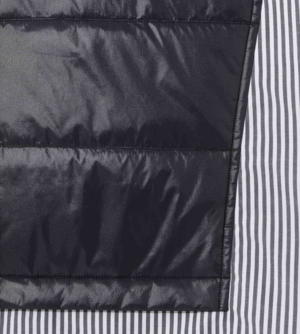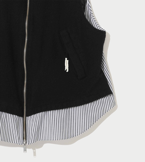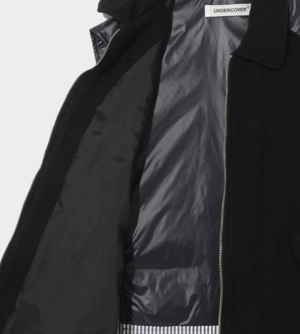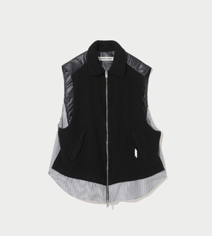 Felted wool and quilted vest with cotton shirt inserts, front zipper pocket, and cupro lining. Vendor style: UP2E1001. Color: Black. Surface1: 90% Wool, 10% Nylon; Surface2: 100% Nylon; Partly: 100% Cotton; Filling: 100% Polyester; Lining: 100% Cupro. Made in Japan.