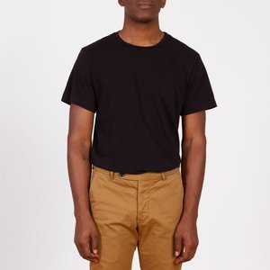 Garment-dyed, short sleeve T-shirt in Black. Cut and sewn in Los Angeles from a soft, texturized jersey that wears well with age. Standard fitting with a screen-printed tag. - Made in the USA - 100% Cotton - Pre-shrunk - Machine wash cold, tumble dry low - Muhammad is 5'10", 165 lbs and wearing a size Medium