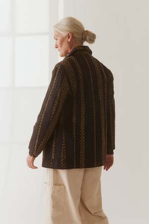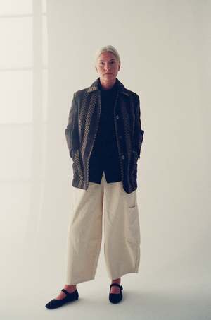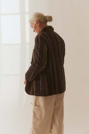 The Nicole Jacket is crafted in a classic UNISECON silhouette with a round collar and single-button front closure. The fabric is intricately handwoven, blending wool, cotton, and polyester in a striking combination of black and gold hues. The careful hand-weaving process ensures each piece has its own distinct texture, showcasing the artistry behind the design. Material: 100% Organic Cotton Weave: 60% Wool, 20% Cotton, 20% Polyester Measurements: XS: US size 2, S: US size 4-6, M: US size 8-10 This garment is designed with an oversized aesthetic in mind. If you prefer a more tailored fit, size down.