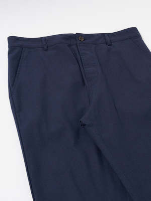 The Military Chino in Valencia Navy from Universal Works is a slimmer-fitting trouser and a contemporary take on a classic style. Great fitting and flattering, these are not too tight and not too loose, clean and neat through the hips and thigh, with a taper towards the ankle. - 45% Recycled Cotton, 25% Polyester, 15% Viscose, 15% Recycled Acrylic - Comfortable, loose fit through the hips and thigh - Leg tapers through to hem - Mid-rise - Button fly - Two front pockets - Two rear jetted buttoned pockets