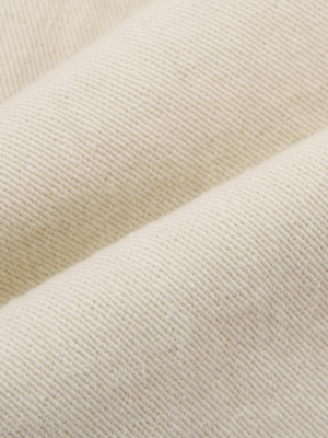 The Universal Works Pleated Track Pant in Koko Cotlin Ecru is a tapered trouser with a single pleat front. A drawstring waist has been added for a comfortable, adjustable fit. The fabric is a lightweight, dry-handled textured ecru denim, made from a mix of cotton and linen that gives it a slubby, lightweight character. - Loose fit - Elasticated and drawstring waist - Single pleat front - Tapered leg - Two front pockets with internal ticket pocket - Two rear pockets: buttoned flap and button jetted - Button fly - 79% cotton, 21% linen outer - 100% cotton pocket bag