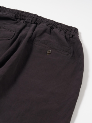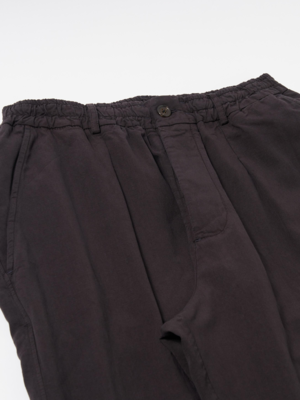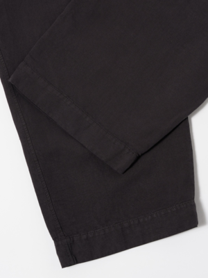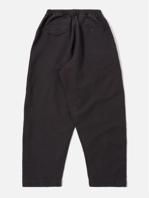 The Oxford Pant in Licorice Lyo from Universal Works is a single-pleat front, wide-leg trouser with a slight taper. It has a fuller and larger shape when compared to the Pleated Track Pant. A plain weave in a blend of cotton, linen, and lyocell is then garment-dyed for a washed, relaxed look. This has a smooth, dry hand feel with some fluidity. - Cotton/linen/lyocell blend - Wide, loose leg - Elasticated and drawstring waist - Button fly - Single-pleat front - Two rear pockets, buttoned flap and button-jetted - Two front pockets with internal ticket pocket