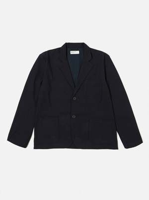 The Two Button Jacket in Ospina Dark Navy from Universal Works is made from a loosely woven seersucker in a blend of up-cycled fibres, which give a slight marl effect to the rich navy colour. This has become a firm summer favourite due to its deceptive airiness. - Long, wide lapel - Two-piece sleeve - Two lower patch pockets - One chest patch pocket