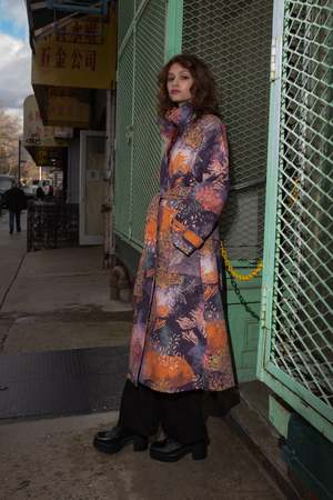 The Nymoni trench coat features hand painted artwork Tramuntana. Oversized, long trench coat crafted from textured certified organic cotton. Features label collar, welt pockets at hip and front double breasted closure. Our hand-painted print Tramuntana explores the dark sublimity of a miniature forest: tiny trees, the smallest of leaves, microscopic pink mosses. Shadows bloom in starbursts, moving on puffs of wind. - Oversized fit - Kazin is 5' 9" and wears size Small - Double breast button closure - Two welt pockets - Self-belt at waist - Side vents - Eco Dry Clean recommended - 100% Certified Organic Cotton - Vegan - Biodegradable Delivery & Returns