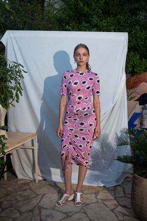 The Nexus dress features UIM custom hand painted artwork Opia Rose. Flattering fitted mid length dress crafted from soft bamboo jersey. Lightweight and semi-sheer with adjustable asymmetrical pull from hem and pull on style. In Opia Rose, obsidian poppies burst spontaneously over flamingo pink meadows. Out past the edge of the world people wear flowers like this. - Fits true to size - Emma is 5' 9 and wears size Small - Semi-sheer - Eco Dry Clean recommended or machine wash cold with like colors - Cool iron only - 92% Bamboo 8% EA - Vegan - Biodegradable